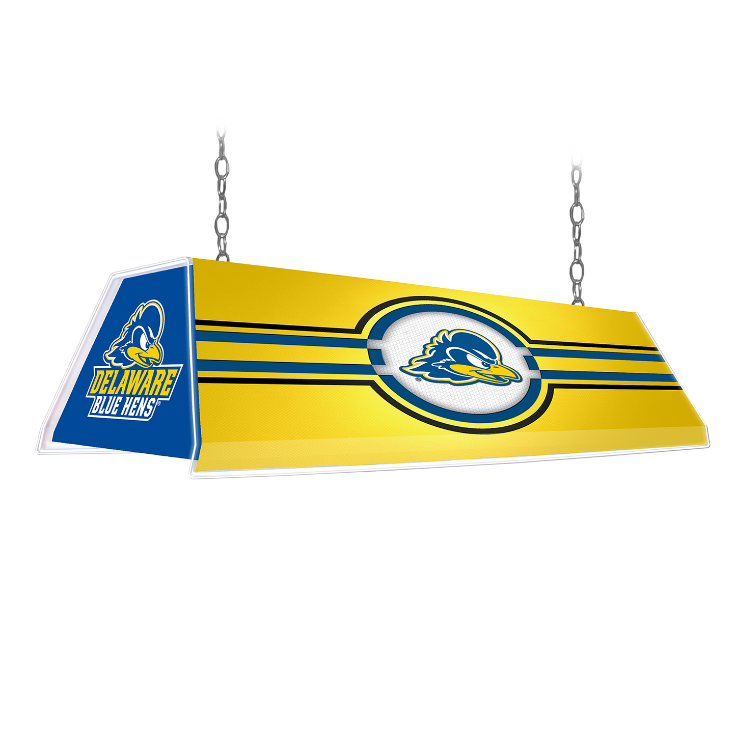 Our New Delaware Blue Hens Edge Glow pool table light adds that Ultra-Modern design to your fan cave or billiard room! Show pride in your favorite team with this official 46 inch long by 14 inch tall and 10 inch wide billiards table hanging light. The Edge Glow corners and Injection molding really make this light stand out, it also features a high-resolution image with a high gloss finish and metallic trim. Hanging chains and hardware are included, as well as the 50 watt Linear Fluorescent Bulb. This is an officially licensed product of the Delaware Blue Hens and the NCAA and made in the USA.