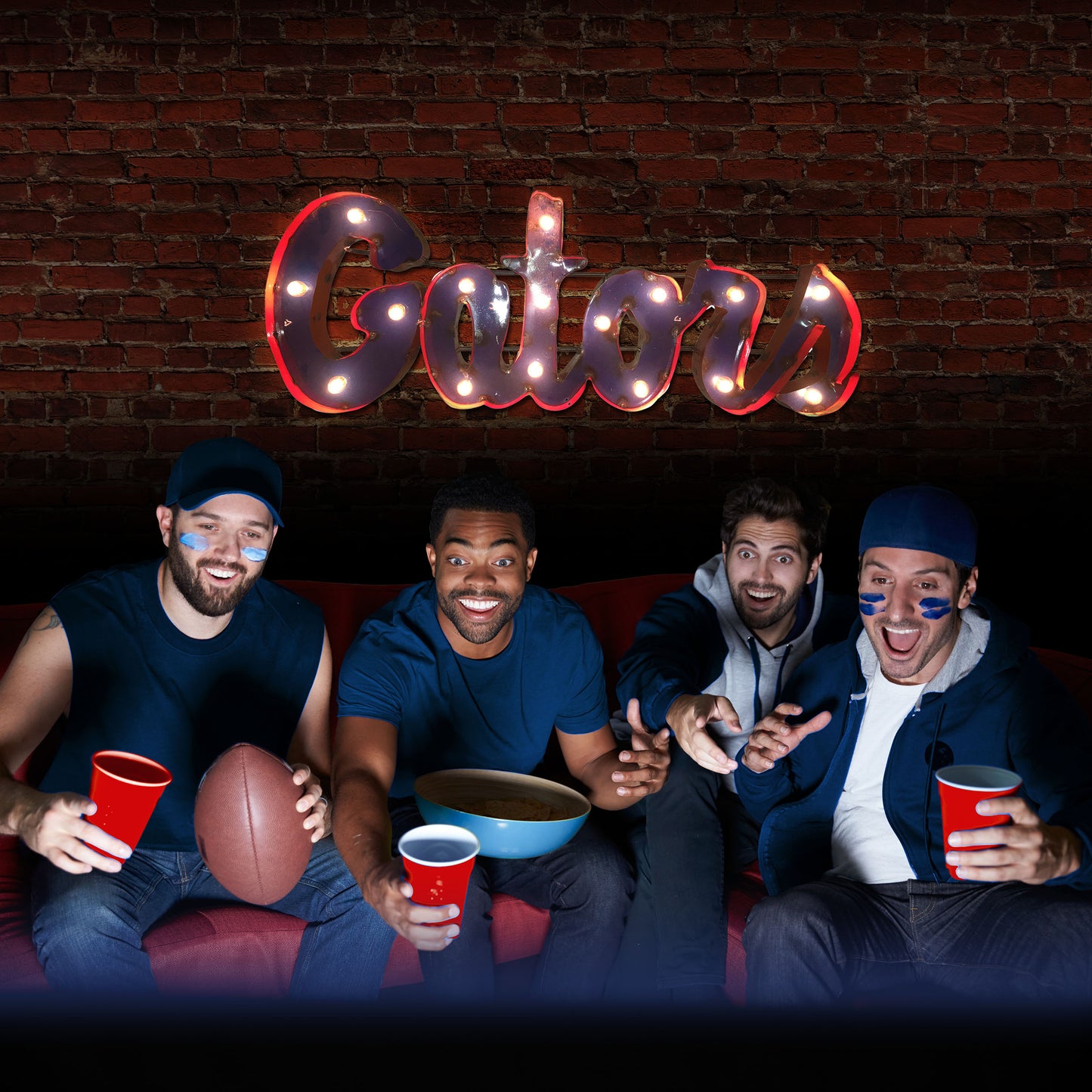 Light up your Man Cave, She Shed, or Game Room with this Florida Gators Team Word-mark Lighted Recycled Metal Sign. Suitable for indoor or outdoor use, this classic retro looking sign is built by hand from recycled metals and includes light strands with clear, incandescent C7 glass bulbs. An authentic style decor piece for your home or outdoor space, the sign features channel lettering and exposed weld spots that give a unique, retro look for the biggest Florida Gators fans! Wall Mount design that is ready to hang.